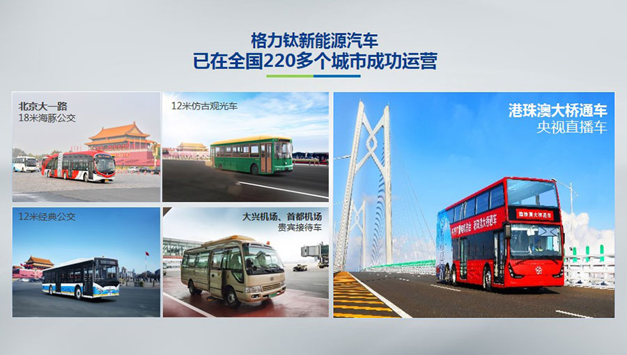 目前,格力鈦生產(chǎn)的新能源汽車于北京、杭州、武漢、青島、哈爾濱、包頭、??诘热珖?20多個城市運營。2014年,仿古鐺鐺車榮膺第22屆北京APEC會議官方指定用車、登陸北京環(huán)天安門旅游觀光線;2016年,雙層巴士榮膺第二屆中美低碳峰會指定用車、登陸國內(nèi)首條純電動雙層觀光車線路——北京城市旅游觀光3線;2017年,18米海豚公交車投入北京長安街1路運營;2018年,港珠澳大橋正式通車,雙層巴士擔(dān)綱中央廣播電視總臺直播車,成為首輛駛上港珠澳大橋的大巴車。