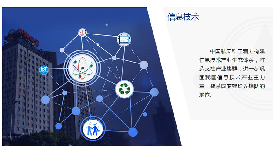 信息技術(shù)應(yīng)用創(chuàng)新產(chǎn)業(yè)助力網(wǎng)絡(luò)強(qiáng)國建設(shè),以航天系統(tǒng)工程優(yōu)勢服務(wù)于國家信息安全和經(jīng)濟(jì)安全;工業(yè)互聯(lián)網(wǎng)平臺——航天云網(wǎng)大力推進(jìn)新一代信息技術(shù)與傳統(tǒng)產(chǎn)業(yè)全方位深度融合,為全球制造業(yè)企業(yè)提供智能制造、協(xié)同制造、云制造服務(wù);智慧產(chǎn)業(yè)面向政府、行業(yè)和企業(yè)應(yīng)用需求,構(gòu)建智慧系統(tǒng)平臺,打造各類專業(yè)應(yīng)用,助力國民經(jīng)濟(jì)結(jié)構(gòu)戰(zhàn)略性調(diào)整。
