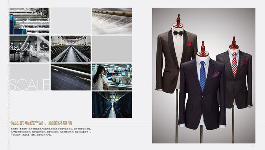 公司具備年生產(chǎn)粗精紡呢絨1000萬(wàn)米,經(jīng)營(yíng)規(guī)模在全國(guó)毛紡織行業(yè)中居前五強(qiáng)。服裝制造:在服裝制造領(lǐng)域,澳洋集團(tuán)擁有自主品牌“澳洋”和“沃爾芬”,生產(chǎn)西服、西褲、襯衫、夾克、防寒服、毛衣、工裝等全系列產(chǎn)品,年產(chǎn)中高檔職業(yè)裝150萬(wàn)套、襯衫120萬(wàn)件。澳洋服裝廠擁有國(guó)際最為先進(jìn)的美國(guó)“格柏”CAD設(shè)計(jì)系統(tǒng)及自動(dòng)裁床、德國(guó)“杜克普”、美國(guó)“格柏”和日本重機(jī)專(zhuān)業(yè)縫制設(shè)備、意大利全套“邁埤”整燙系統(tǒng)、加拿大“衣拿”、德國(guó)“百福”智能吊掛系統(tǒng)等。精紡廠的生產(chǎn)設(shè)備從條染、紡紗、織造、后整理和檢驗(yàn)檢測(cè)設(shè)備95%從德國(guó)、意大利和日本進(jìn)口。公司已發(fā)展成為國(guó)內(nèi)技術(shù)裝備最先進(jìn)、生產(chǎn)工藝最完善的精品職業(yè)服裝和面料生產(chǎn)基地。