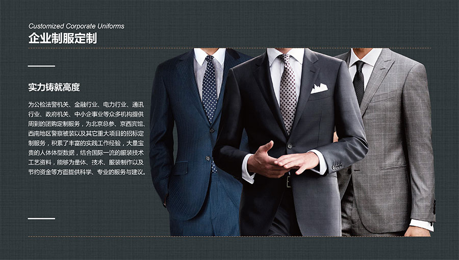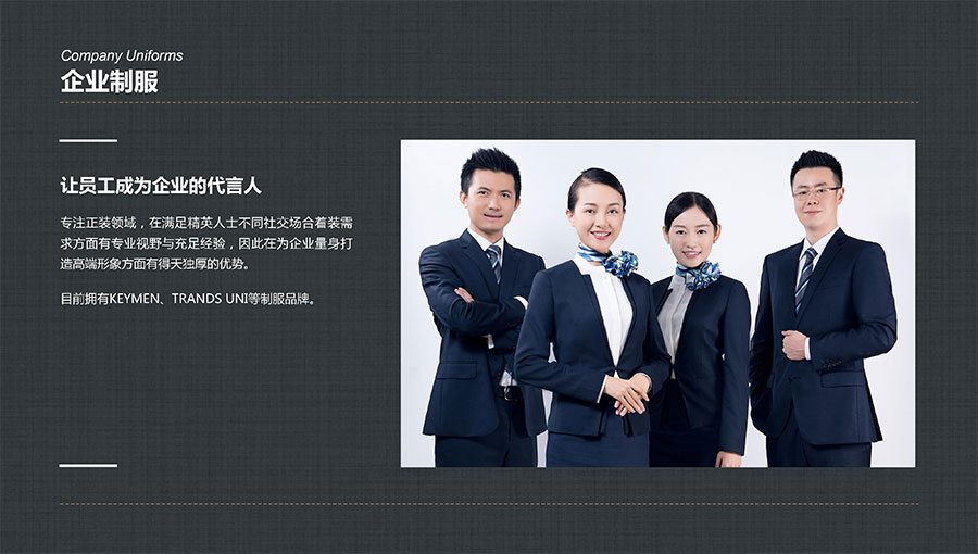 凱門品牌(KEYYMEN):高級(jí)職業(yè)裝品牌,企業(yè)形象定制專家。以精湛工藝及最優(yōu)性價(jià)比打造高品質(zhì)、個(gè)性時(shí)尚的企業(yè)形象,專屬于那些為理想、為事業(yè)打拼,并在成功過程中享受生活的職場(chǎng)團(tuán)隊(duì)及精英人士。