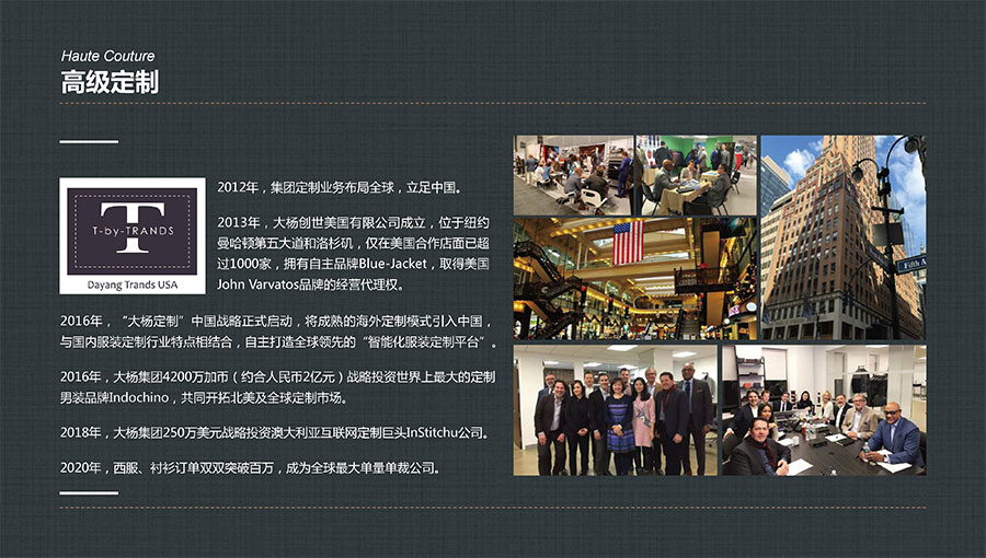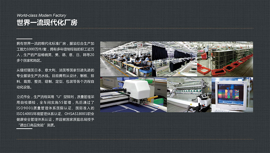 大楊集團(tuán)主要從事生產(chǎn)和銷售各類中高檔服裝產(chǎn)品,以西裝縫制享譽(yù)全球。年服裝綜合生產(chǎn)加工能力1100萬件/套,年西服出口量600萬件/套,年服裝定制產(chǎn)量200萬件/套,連續(xù)多年排名全國(guó)第一,是全球重要的西裝生產(chǎn)基地。