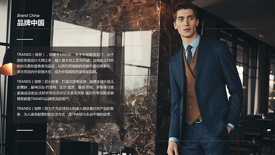 創(chuàng)世品牌(TRANDS):創(chuàng)建于1995年,是當(dāng)今中國(guó)高級(jí)男裝的代表品牌之一。TRANDS創(chuàng)世成衣產(chǎn)品及量身定制的西裝以其至臻品質(zhì)和精湛工藝,贏得眾多國(guó)際政商精英多年來的青睞。