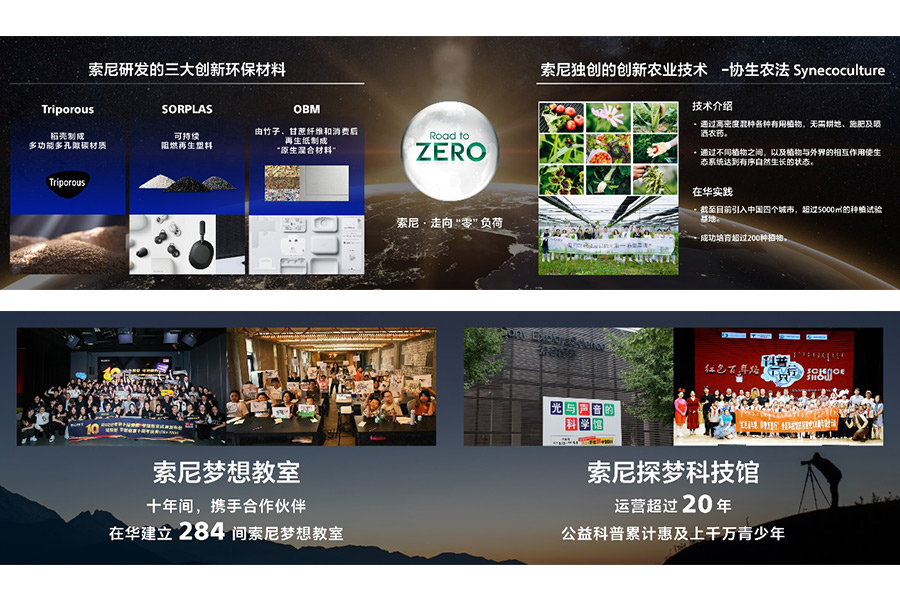 在發(fā)展各項業(yè)務(wù)的同時,索尼矢志不渝履行對地球的“責(zé)任”,并通過技術(shù)和業(yè)務(wù)為地球做“貢獻”。在“走向零負(fù)荷”的環(huán)境目標(biāo)指導(dǎo)下,在中國,索尼已從2020-2022財年連續(xù)實現(xiàn)100%可再生能源用電,并將多樣創(chuàng)新的環(huán)保技術(shù)成果引入中國:包括將多樣植物高密度混種以回歸自然生態(tài)的“協(xié)生農(nóng)法”,索尼獨自開發(fā)的三大創(chuàng)新環(huán)保材料SORPLARSTM,TriporousTM,OBM等。