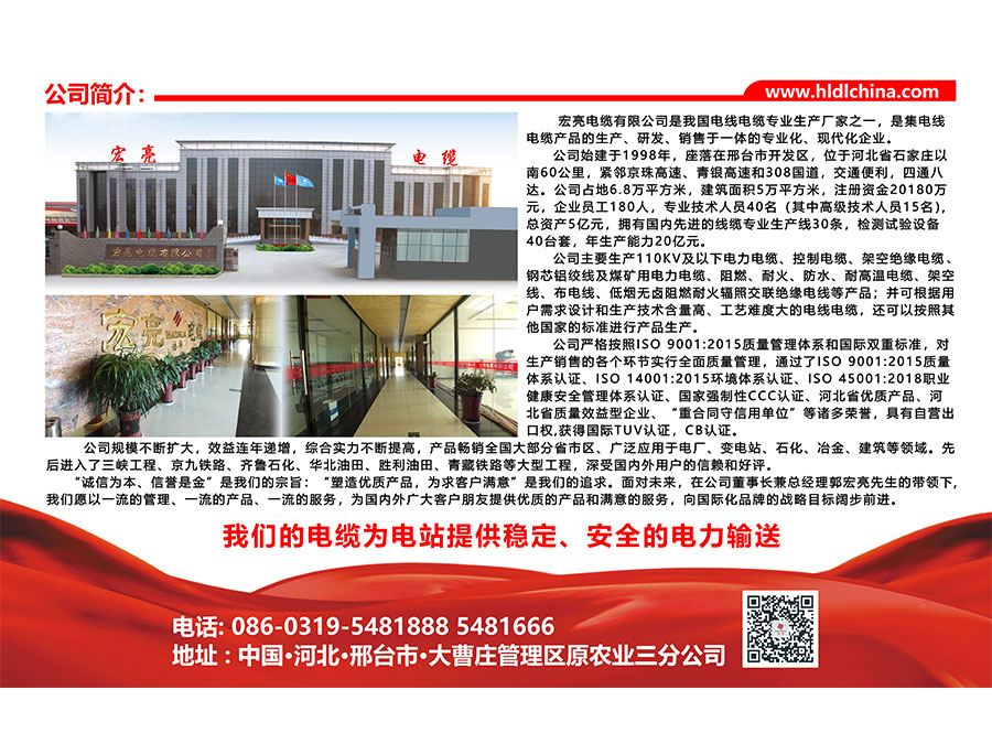 主要產(chǎn)品:“宏亮電纜”110KV及以下電力電纜、鋼絲鎧裝電纜、鋁合金電纜、控制電纜、光伏電纜、各種礦用電纜、阻燃、耐火、防水、耐高溫電纜、架空線、布電線、低煙無鹵阻燃耐火輻照交聯(lián)絕緣電線以及PVC電纜顆粒、銅桿、銅導體等電纜輔料產(chǎn)品