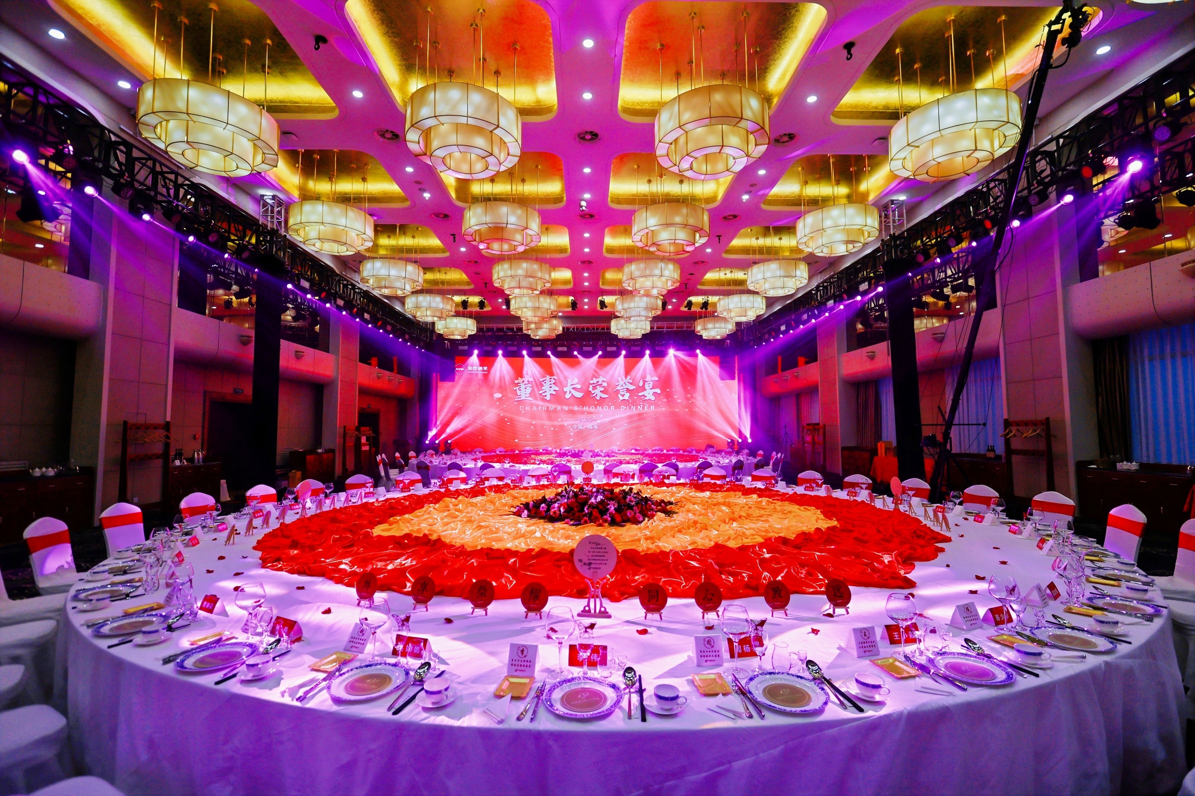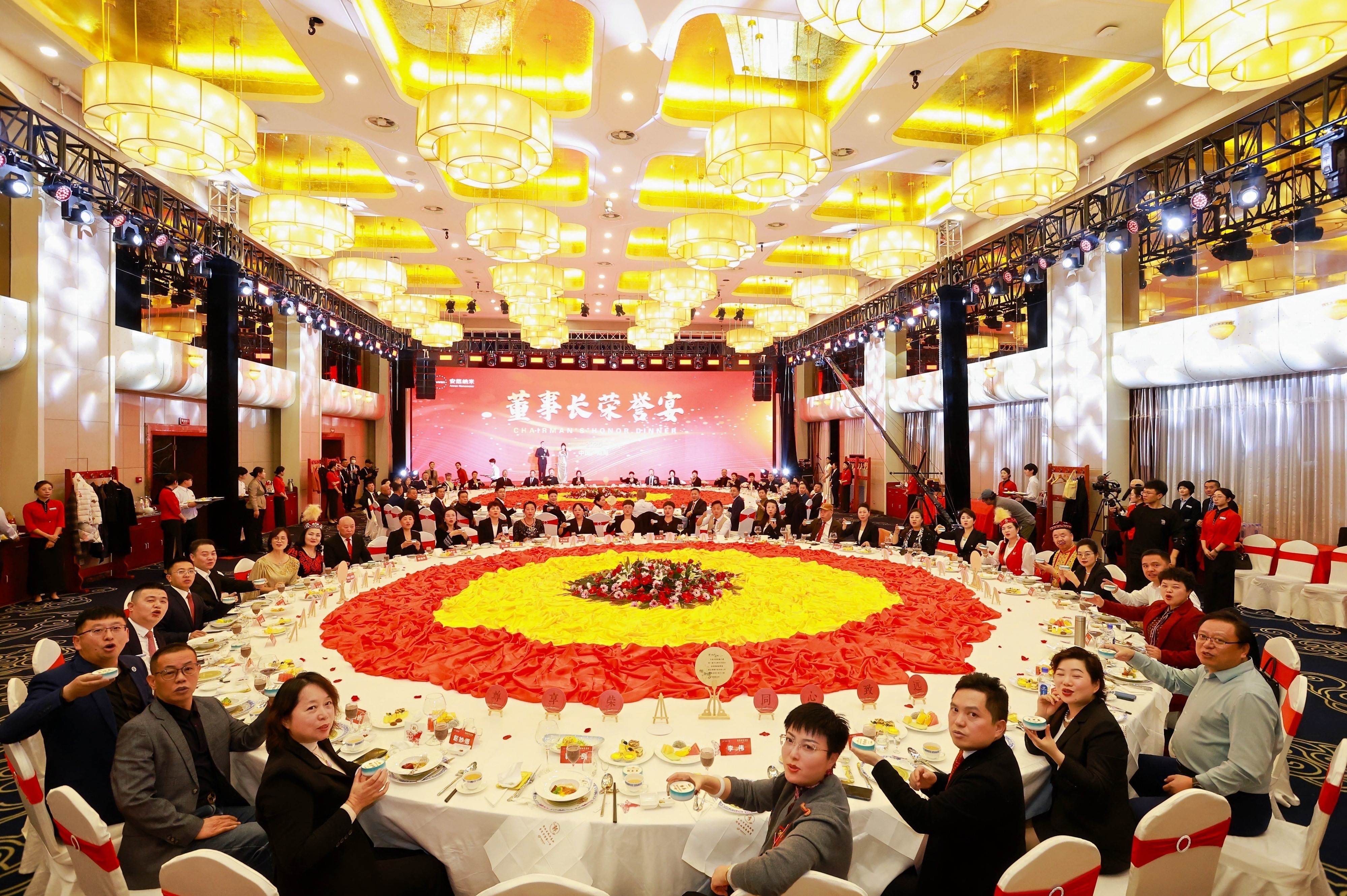 歷經(jīng)一年市場打拼,近80位市場精英憑實力贏得與董事長共宴的珍貴機會。安然公司特意定制2張直徑長達10米的巨型桌宴,既打破常規(guī)宴請格局,更以“好事成雙”的美好寓意,致敬每一份實打?qū)嵉臉I(yè)績與貢獻。