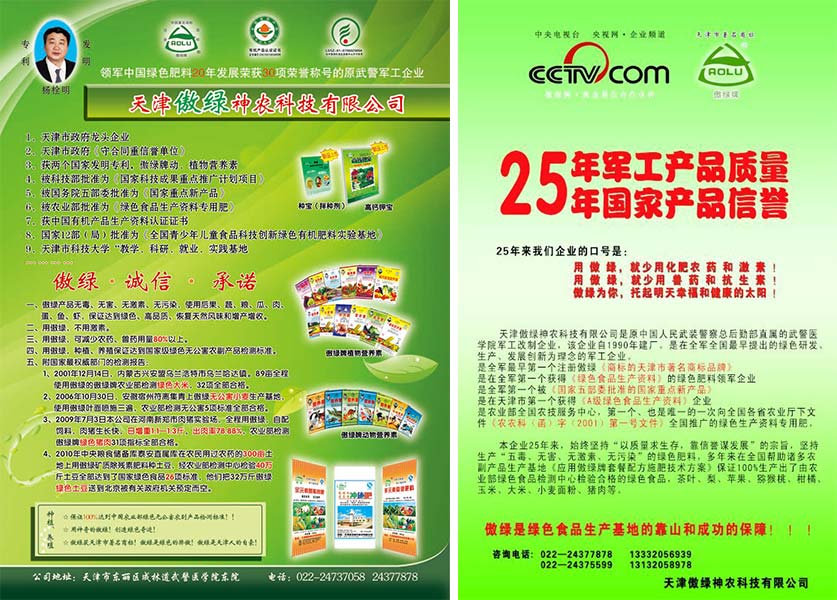 傲綠公司有15年的軍工發(fā)展史和改制后10年的民營市場共計(jì)25年的歷程,是專門生產(chǎn)和研發(fā)綠色農(nóng)業(yè)生產(chǎn)資料的高科技企業(yè)實(shí)體。董事長楊栓明先生發(fā)明的傲綠牌動、植物營養(yǎng)素,動、植物礦質(zhì)除殘素獲國家四項(xiàng)發(fā)明專利,曾獲天津市政府頒發(fā)的“科技進(jìn)步獎”、“天津市著名商標(biāo)”,國家科技部頒發(fā)的《科技成果重點(diǎn)推廣計(jì)劃指南》證書,國家五部委聯(lián)合頒發(fā)《國家重點(diǎn)新產(chǎn)品》證書,被中國綠色食品發(fā)展中心認(rèn)定為《A級綠色食品生產(chǎn)資料》,被中國科協(xié)授予《全國百項(xiàng)農(nóng)業(yè)精品推薦項(xiàng)目》以及國內(nèi)外博覽會上多項(xiàng)金獎,動物營養(yǎng)素2005年4月被天津市飼料辦批準(zhǔn)為無公害予混合飼料。