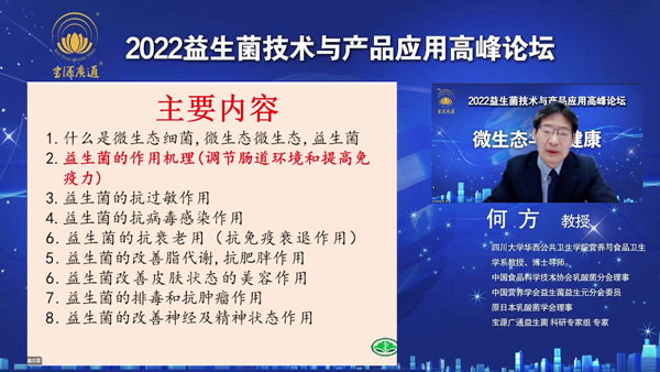 何方教授從益生菌對(duì)人體健康的眾多重要作用,又從科研實(shí)驗(yàn)及國(guó)內(nèi)外全球視角把益生菌的功能、產(chǎn)品應(yīng)用做了專業(yè)講解。對(duì)寶源廣通益生菌的菌株、高活菌等科學(xué)組方做了分析推薦。