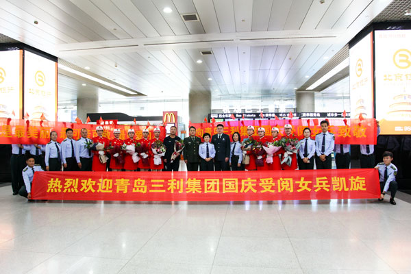 2019年10月5日是個歡樂的日子,青島流亭機場,9名身著紅色受閱服裝的姑娘們一下飛機,就受到了熱烈歡迎,幾名姑娘在與前來迎接她們的同事?lián)肀r激動地流下了淚水。這9名成員是青島三利集團參加慶祝中華人民共和國成立70周年大閱兵的鏗鏘玫瑰。就在幾天前,她們作為民兵方隊成員走過天安門廣場,接受祖國和人民檢閱,成為許多人眼中一道靚麗的風景線。