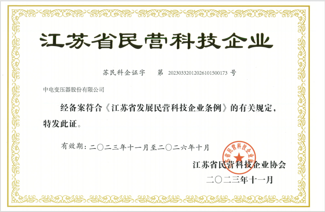 中電變壓器榮獲“江蘇省民營科技企業(yè)”稱號