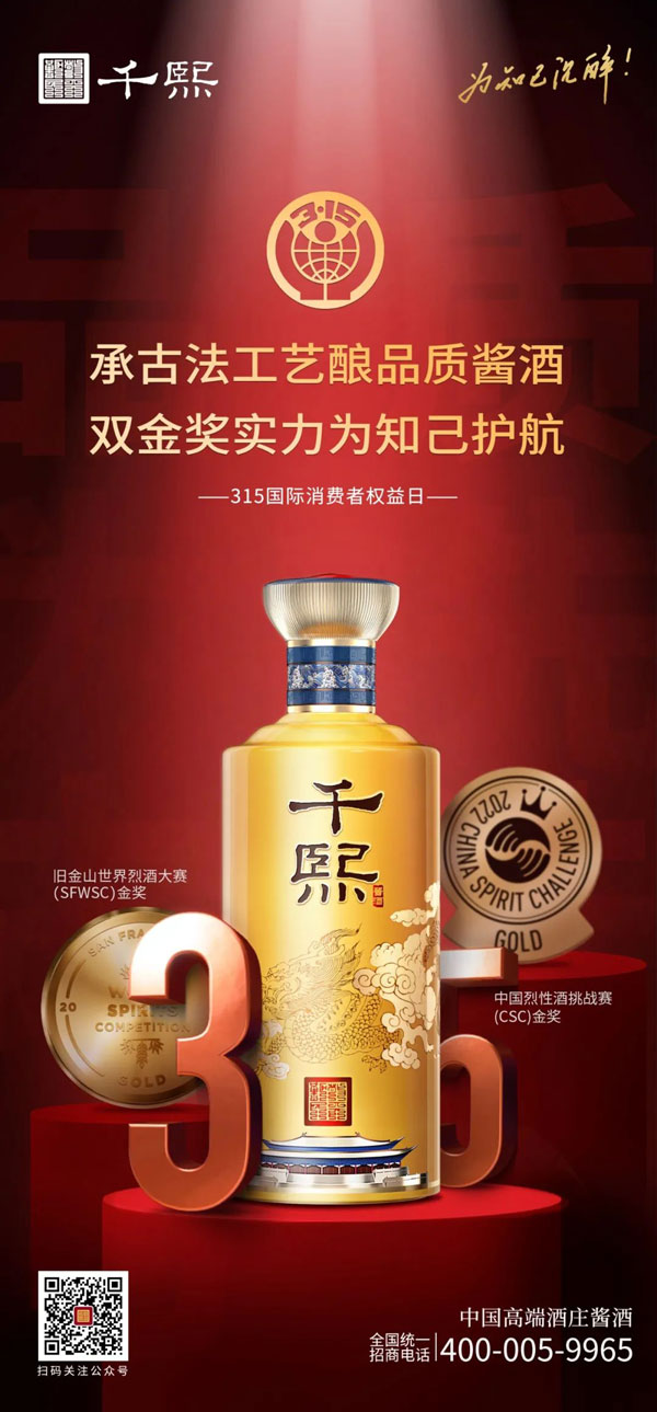 每一年的315消費者權益日,大眾對食品安全,消費安全總是格外敏感。作為一家以“抱樸守真 一諾千年”為品質理念的醬酒企業(yè),從“舊金山世界烈酒大賽金獎”到榮獲“CSC 中國烈性酒挑戰(zhàn)賽金獎”等稱號,千熙酒業(yè)始終不忘初心,以消費者至上為宗旨,以品牌為責任,為消費者打造品質以恒持的一杯好酒。