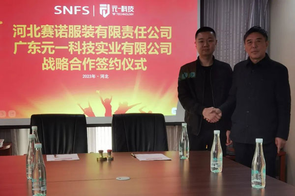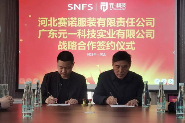 2023年2月27日,河北賽諾服裝有限責任公司同廣東元一科技實業(yè)有限公司在石家莊品匯大廈簽署了戰(zhàn)略合作協(xié)議,河北賽諾將引進十臺價值數(shù)百萬元的自動鋪布和自動裁床設備,旨在通過加強雙方在科技方面的協(xié)作進一步深化戰(zhàn)略伙伴關(guān)系,推動雙方在數(shù)字化、自動化、智能化等方面的深度合作和公司的長遠發(fā)展。