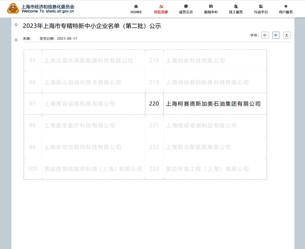 日前,從上海市經濟和信息化委員官方網站發(fā)布的資訊顯示,2023年上海市專精特新中小企業(yè)名單(第二批)已經公示,位于中國(上海)自貿區(qū)的上海柯賽德斯加美石油集團有限公司進入公示名單。