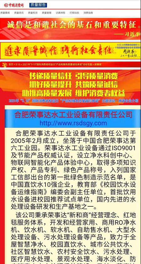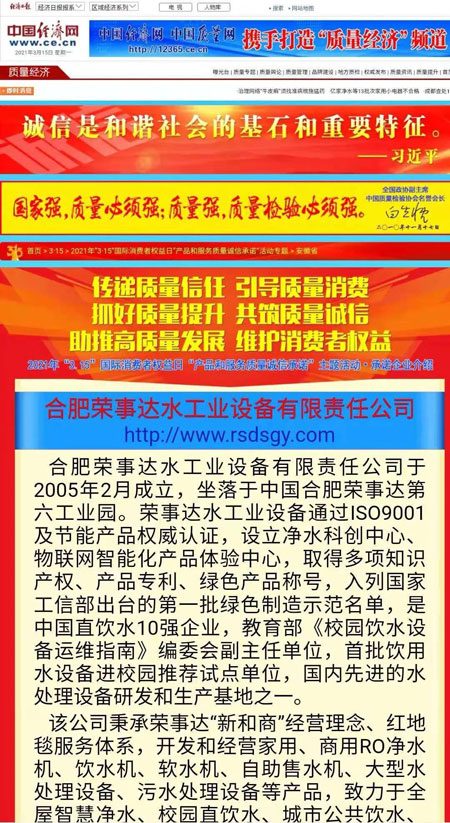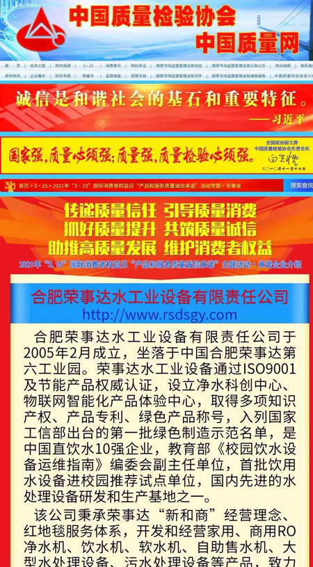 共筑質量誠信,引導質量消費。在由中國質量檢驗協(xié)會主辦的2021年“3.15”國際消費者權益日“產品和服務質量誠信承諾”主題活動中,榮事達憑借卓越的產品品質及良好的社會形象,榮膺“全國產品和服務質量誠信示范企業(yè)”“全國質量信得過產品”“全國凈水行業(yè)質量領先品牌”“全國質量誠信先進企業(yè)”多項榮譽,《中國質量報》、《中國消費者報》及中國質量網(wǎng)、中國經濟網(wǎng)、中國消費網(wǎng)等多家媒體均予以集中展示和公告。