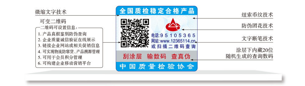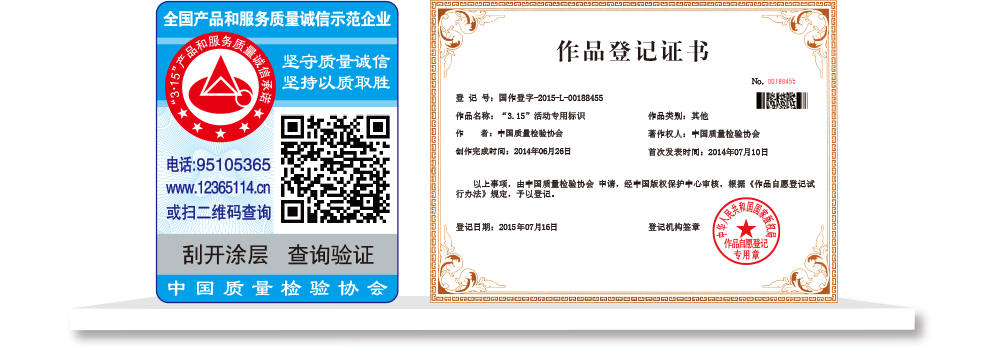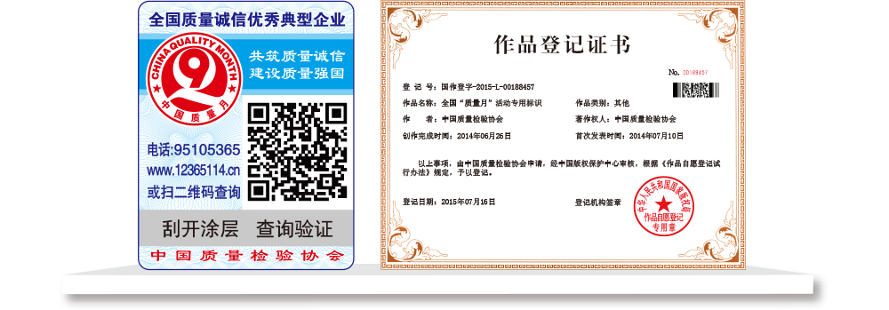 【“全國質(zhì)檢穩(wěn)定合格產(chǎn)品”專用標(biāo)識】具有專屬的知識產(chǎn)權(quán)(經(jīng)中國版權(quán)保護(hù)中心審核,國家版權(quán)局對“全國質(zhì)檢穩(wěn)定合格產(chǎn)品”專用標(biāo)識頒發(fā)了《作品登記證書》,登記號:國作登字-2015-L-00188456),基本規(guī)格為5cm2,集電話電碼防偽查詢、二維碼在線掃描、微信驗(yàn)證等多種功能于一體,綜合運(yùn)用了紐索幣紋、微縮文字、熒光激發(fā)油墨等多種防偽技術(shù);專用標(biāo)識加貼在產(chǎn)品或包裝上,消費(fèi)者只需要用座機(jī)(手機(jī))電話撥打全國范圍內(nèi)都不需要加區(qū)號的特服號碼95105365或使用手機(jī)掃描二維碼或登陸網(wǎng)站(http://www.12365114.cn)就可直接查詢驗(yàn)證加貼專用標(biāo)識的產(chǎn)品為中國質(zhì)量檢驗(yàn)協(xié)會調(diào)查匯總證明的全國質(zhì)量檢驗(yàn)穩(wěn)定合格產(chǎn)品,助力企業(yè)通過“質(zhì)量檢驗(yàn)”的比較優(yōu)勢去贏得消費(fèi)者更多的信任,形成企業(yè)自己獨(dú)有的比較優(yōu)勢。