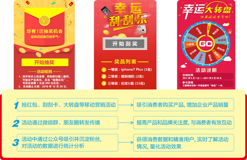 消費(fèi)者購買企業(yè)的產(chǎn)品后,掃描標(biāo)識上的二維碼,參與企業(yè)設(shè)置的搶紅包、刮刮卡、大轉(zhuǎn)盤等營銷互動(dòng)活動(dòng),中獎(jiǎng)后直接進(jìn)入微信公眾號領(lǐng)取,操作簡單方便,在實(shí)現(xiàn)企業(yè)促進(jìn)產(chǎn)品銷售的同時(shí),還可增加企業(yè)微信公眾號的粉絲數(shù)量;同時(shí),充分利用移動(dòng)互聯(lián)網(wǎng)易于傳播的特性,實(shí)現(xiàn)企業(yè)品牌的廣泛傳播,采用多種移動(dòng)創(chuàng)新營銷方式,結(jié)合數(shù)據(jù)統(tǒng)計(jì)分析,幫助企業(yè)實(shí)現(xiàn)精準(zhǔn)營銷;另外,通過抽獎(jiǎng)、助力、積分兌換等主流營銷活動(dòng),吸引、刺激消費(fèi)者持續(xù)消費(fèi)、分享傳播,進(jìn)而有效提高企業(yè)的產(chǎn)品銷量;還有,也可針對企業(yè)某一種產(chǎn)品進(jìn)行單獨(dú)促銷開展?fàn)I銷活動(dòng),消費(fèi)者掃描二維碼參與營銷互動(dòng)活動(dòng),輕松實(shí)現(xiàn)促銷之目的,收集營銷活動(dòng)數(shù)據(jù),借助大數(shù)據(jù)分析,分析消費(fèi)者的特征、分布、消費(fèi)習(xí)慣等信息,引導(dǎo)企業(yè)的市場營銷戰(zhàn)略和銷售策略,使企業(yè)營銷舉措更加精準(zhǔn)有效。