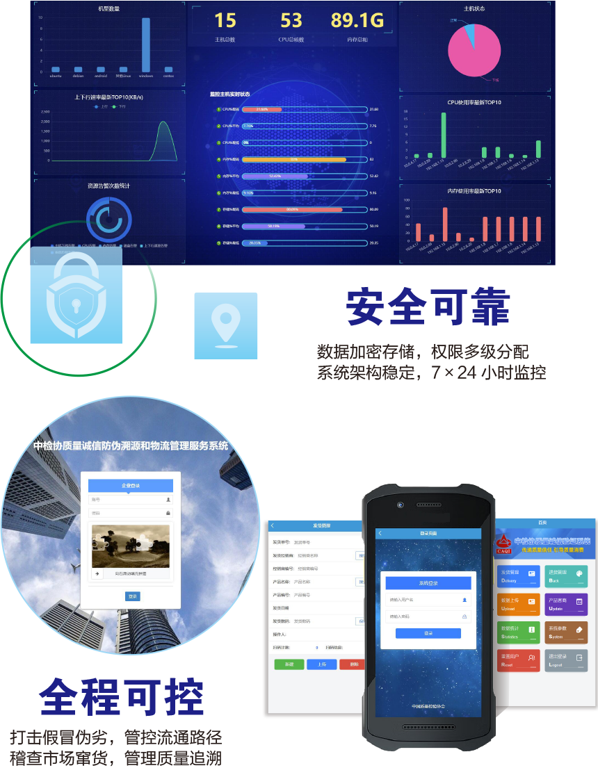 中國質(zhì)量檢驗(yàn)協(xié)會防偽溯源和物流管理服務(wù)系統(tǒng)(簡稱中檢聯(lián)合質(zhì)量誠信驗(yàn)證系統(tǒng))是以物聯(lián)網(wǎng)、大數(shù)據(jù)、云計(jì)算、區(qū)塊鏈和移動(dòng)互聯(lián)網(wǎng)技術(shù)為基礎(chǔ)建設(shè)的全過程防偽溯源與質(zhì)量誠信驗(yàn)證服務(wù)平臺,依托廣大技術(shù)機(jī)構(gòu)的技術(shù)支撐,應(yīng)用二維碼為載體,使用一物一碼防偽技術(shù),同時(shí)采用文字、圖片和視頻等多媒體方式,完整記錄產(chǎn)品的原料來源、生產(chǎn)加工、倉儲物流和市場銷售等詳細(xì)信息,融合實(shí)現(xiàn)產(chǎn)品質(zhì)量來源可查、去向可追、責(zé)任可究的全過程追溯,切實(shí)方便企業(yè)履行質(zhì)量安全主體責(zé)任并用科技、智能化、信息化的手段去加強(qiáng)質(zhì)量安全風(fēng)險(xiǎn)控制,維護(hù)消費(fèi)者合法權(quán)益,讓人民群眾買得放心、吃得放心、用得放心。