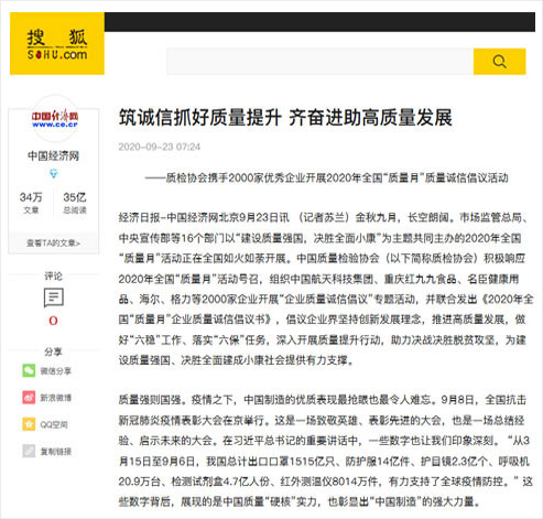 搜狐網(wǎng):筑誠信抓好質(zhì)量提升 齊奮進(jìn)助高質(zhì)量發(fā)展——質(zhì)檢協(xié)會(huì)攜手2000家優(yōu)秀企業(yè)開展2020年全國“質(zhì)量月”質(zhì)量誠信倡議活動(dòng)