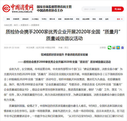 中國網(wǎng):筑誠信抓好質(zhì)量提升 齊奮進(jìn)助高質(zhì)量發(fā)展——質(zhì)檢協(xié)會(huì)攜手2000家優(yōu)秀企業(yè)開展2020年全國“質(zhì)量月”質(zhì)量誠信倡議活動(dòng)