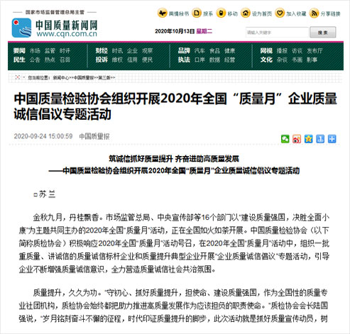 中國質(zhì)量新聞網(wǎng):筑誠信抓好質(zhì)量提升 齊奮進(jìn)助高質(zhì)量發(fā)展——中國質(zhì)量檢驗(yàn)協(xié)會(huì)組織開展2020年全國“質(zhì)量月”企業(yè)質(zhì)量誠信倡議專題活動(dòng)