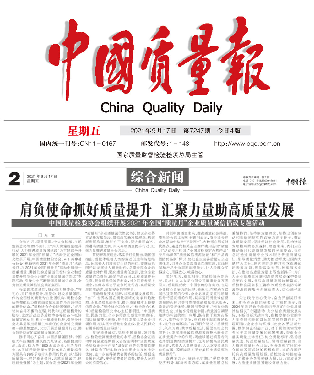 中國(guó)質(zhì)量報(bào):肩負(fù)使命抓好質(zhì)量提升匯聚力量助高質(zhì)量發(fā)展——中國(guó)質(zhì)量檢驗(yàn)協(xié)會(huì)組織開(kāi)展2021年全國(guó)“質(zhì)量月”企業(yè)質(zhì)量誠(chéng)信倡議專(zhuān)題活動(dòng)