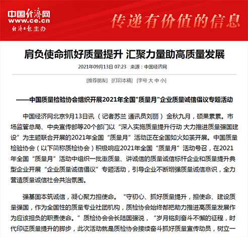 中國(guó)經(jīng)濟(jì)網(wǎng):堅(jiān)持質(zhì)量第一 抓好質(zhì)量提升 共筑質(zhì)量誠(chéng)信 建設(shè)質(zhì)量強(qiáng)國(guó)——2021年全國(guó)“質(zhì)量月”企業(yè)質(zhì)量誠(chéng)信倡議書(shū)