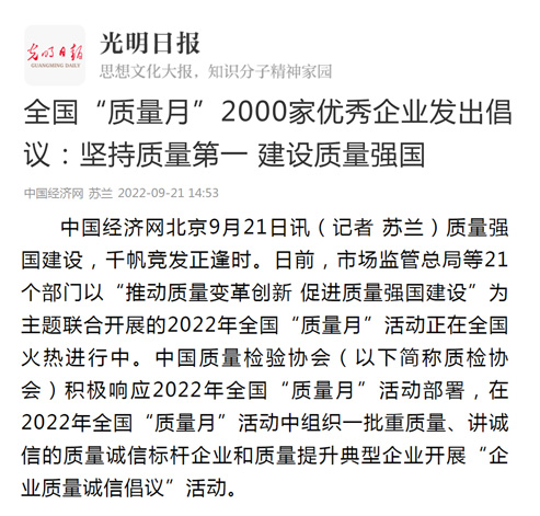 光明日報客戶端:全國“質(zhì)量月”2000家優(yōu)秀企業(yè)發(fā)出倡議:堅持質(zhì)量第一 建設(shè)質(zhì)量強(qiáng)國
