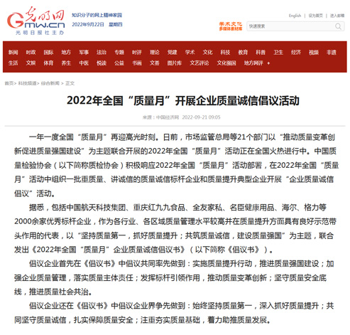 光明網(wǎng):2022年全國“質(zhì)量月”開展企業(yè)質(zhì)量誠信倡議活動