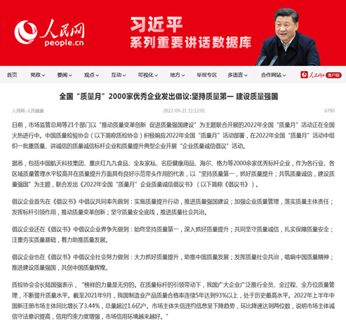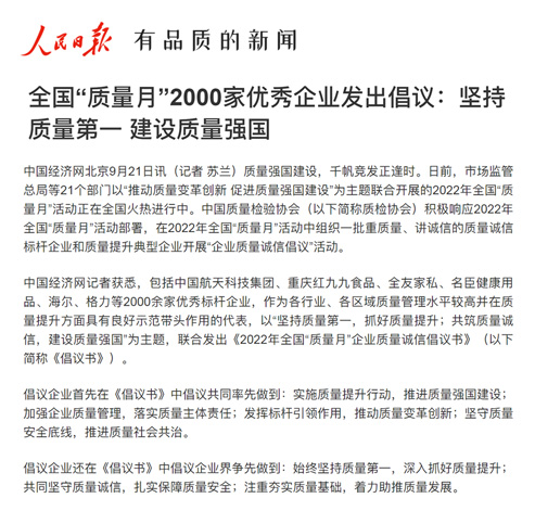 人民網(wǎng):全國“質(zhì)量月”2000家優(yōu)秀企業(yè)發(fā)出倡議:堅持質(zhì)量第一 建設(shè)質(zhì)量強(qiáng)國