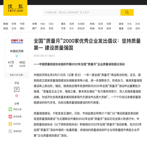 搜狐網(wǎng):匯聚力量攜手抓好質(zhì)量提升 肩負(fù)使命促進(jìn)質(zhì)量強(qiáng)國建設(shè)——2022年全國“質(zhì)量月”企業(yè)質(zhì)量誠信倡議活動綜述