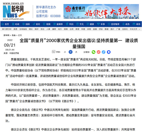 新華網(wǎng):全國“質(zhì)量月”2000家優(yōu)秀企業(yè)發(fā)出倡議:堅持質(zhì)量第一 建設(shè)質(zhì)量強(qiáng)國