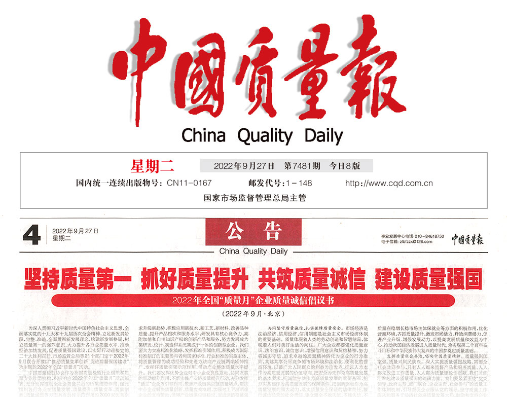 中國消費(fèi)者報:堅持質(zhì)量第一 抓好質(zhì)量提升 共筑質(zhì)量誠信 建設(shè)質(zhì)量強(qiáng)國