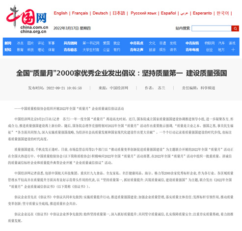 中國經(jīng)濟(jì)網(wǎng):匯聚力量攜手抓好質(zhì)量提升 肩負(fù)使命促進(jìn)質(zhì)量強(qiáng)國建設(shè)——2022年全國“質(zhì)量月”企業(yè)質(zhì)量誠信倡議活動綜述