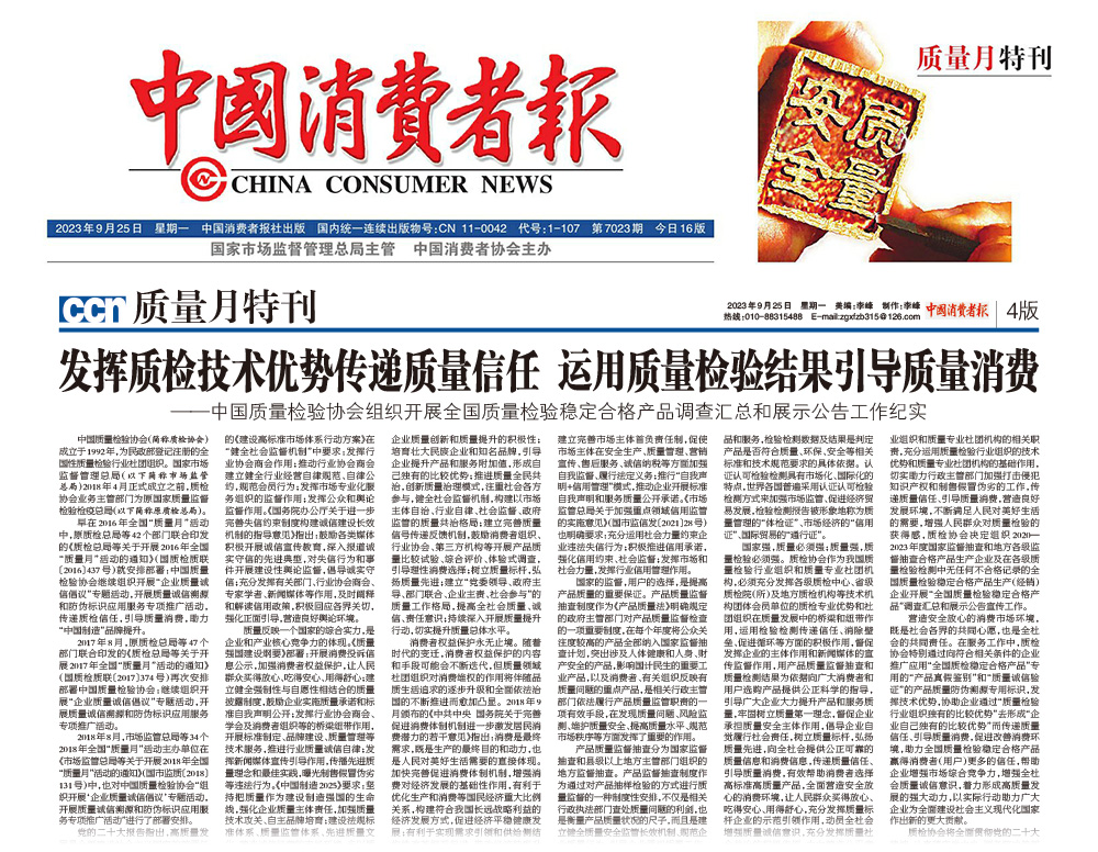 - 中國消費(fèi)者報(bào)——發(fā)揮質(zhì)檢技術(shù)優(yōu)勢(shì)傳遞質(zhì)量信任 運(yùn)用質(zhì)量檢驗(yàn)結(jié)果引導(dǎo)質(zhì)量消費(fèi)——中國質(zhì)量檢驗(yàn)協(xié)會(huì)組織開展全國質(zhì)量檢驗(yàn)穩(wěn)定合格產(chǎn)品調(diào)查匯總和展示公告工作紀(jì)實(shí)