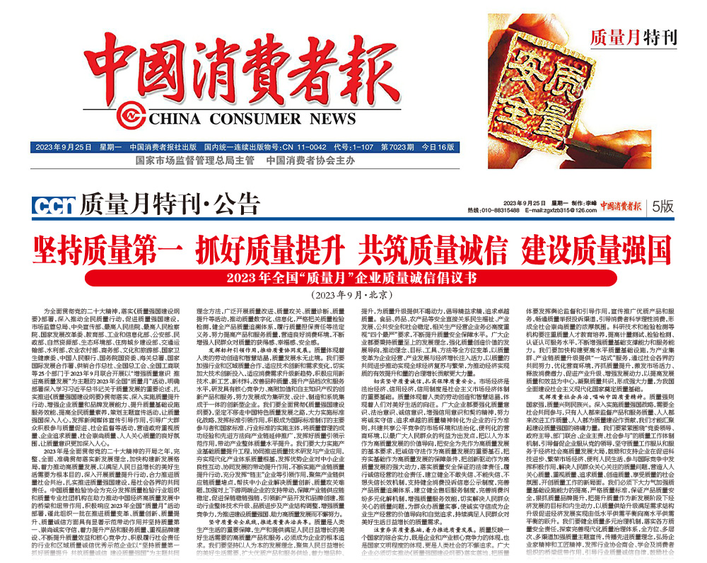- 中國消費(fèi)者報(bào)——堅(jiān)持質(zhì)量第一 抓好質(zhì)量提升 共筑質(zhì)量誠信 建設(shè)質(zhì)量強(qiáng)國——2023年全國“質(zhì)量月”企業(yè)質(zhì)量誠信倡議書