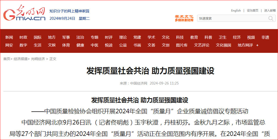 - 中國經(jīng)濟(jì)網(wǎng)—發(fā)揮質(zhì)量社會共治 助力質(zhì)量強(qiáng)國建設(shè)——中國質(zhì)量檢驗(yàn)協(xié)會組織開展2024年全國“質(zhì)量月”企業(yè)質(zhì)量誠信倡議專題活動
