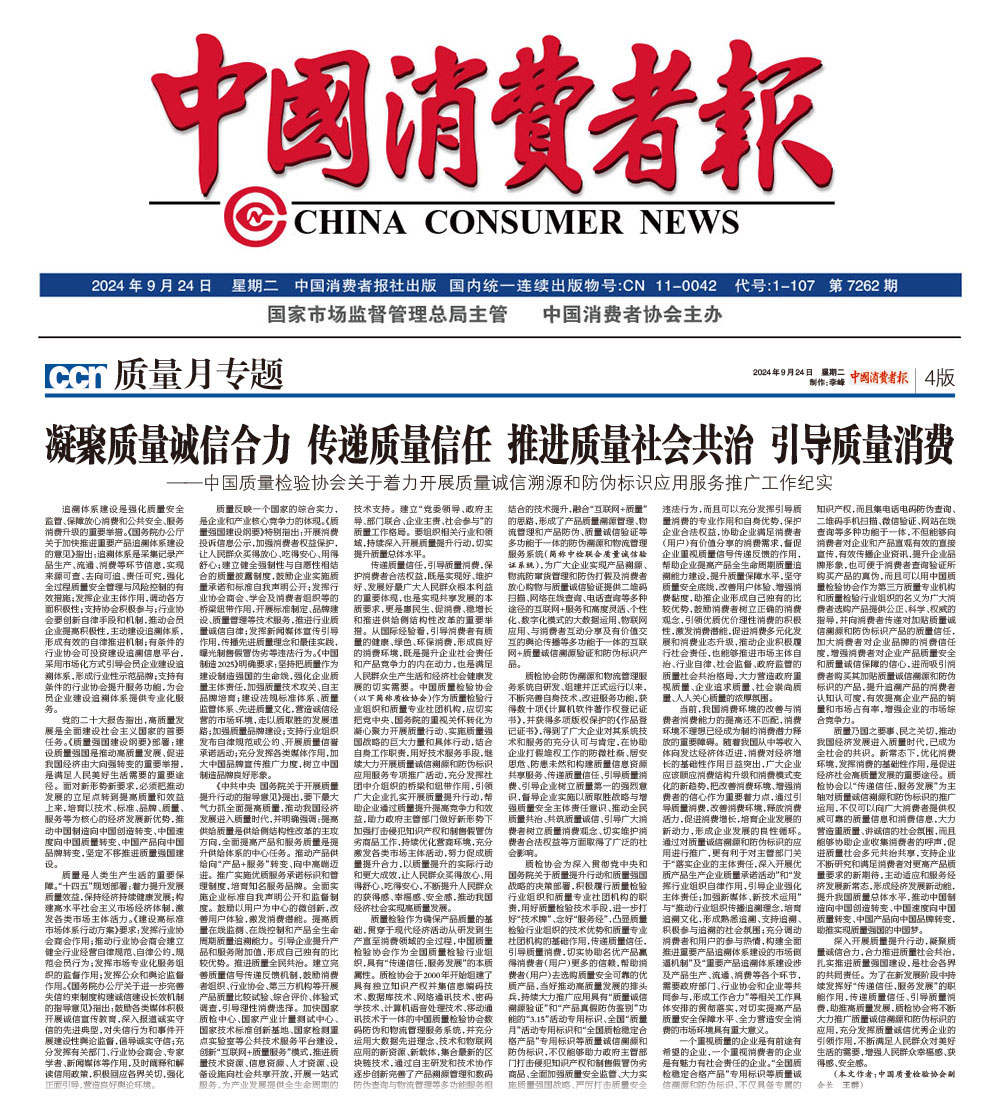 - 中國消費(fèi)者報—凝聚質(zhì)量誠信合力 傳遞質(zhì)量信任 推進(jìn)質(zhì)量社會共治 引導(dǎo)質(zhì)量消費(fèi)——中國質(zhì)量檢驗(yàn)協(xié)會關(guān)于著力開展質(zhì)量誠信溯源和防偽標(biāo)識應(yīng)用服務(wù)推廣工作紀(jì)實(shí)