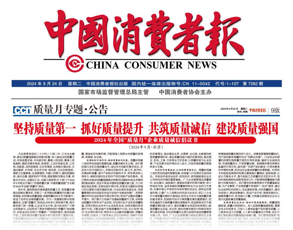 - 中國質(zhì)量報—堅持質(zhì)量第一抓好質(zhì)量提升 共筑質(zhì)量誠信 建設(shè)質(zhì)量強(qiáng)國——2024年全國“質(zhì)量月”企業(yè)質(zhì)量誠信倡議書(2024年9月·北京)