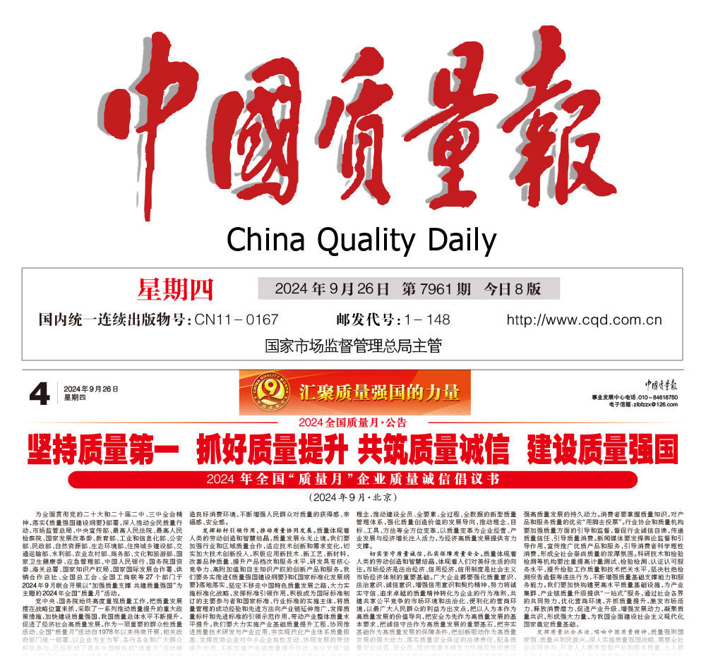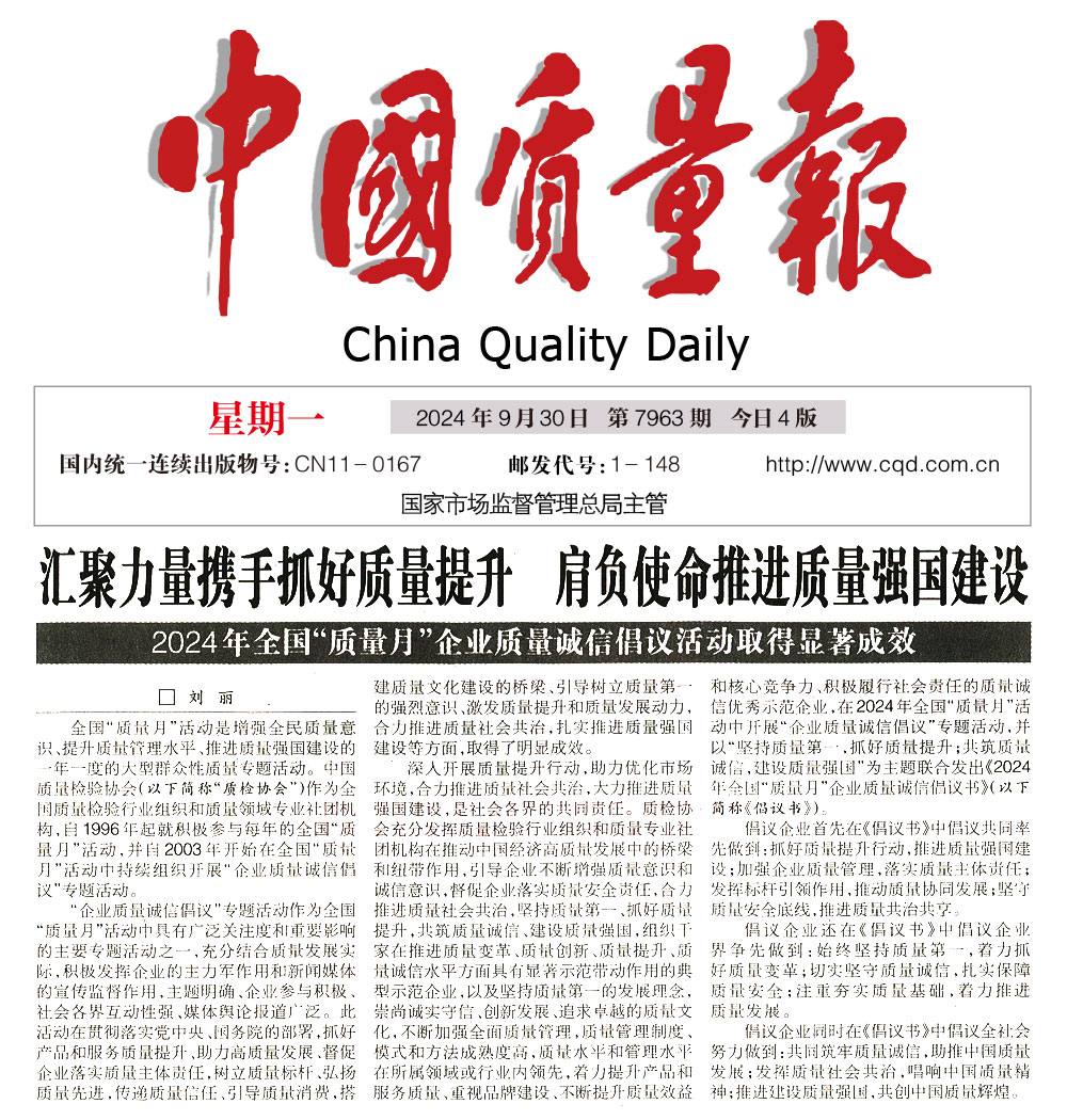 - 中國質(zhì)量報—匯聚力量攜手抓好質(zhì)量提升 肩負(fù)使命推進(jìn)質(zhì)量強(qiáng)國建設(shè)——2024年全國“質(zhì)量月”企業(yè)質(zhì)量誠信倡議活動取得顯著成效